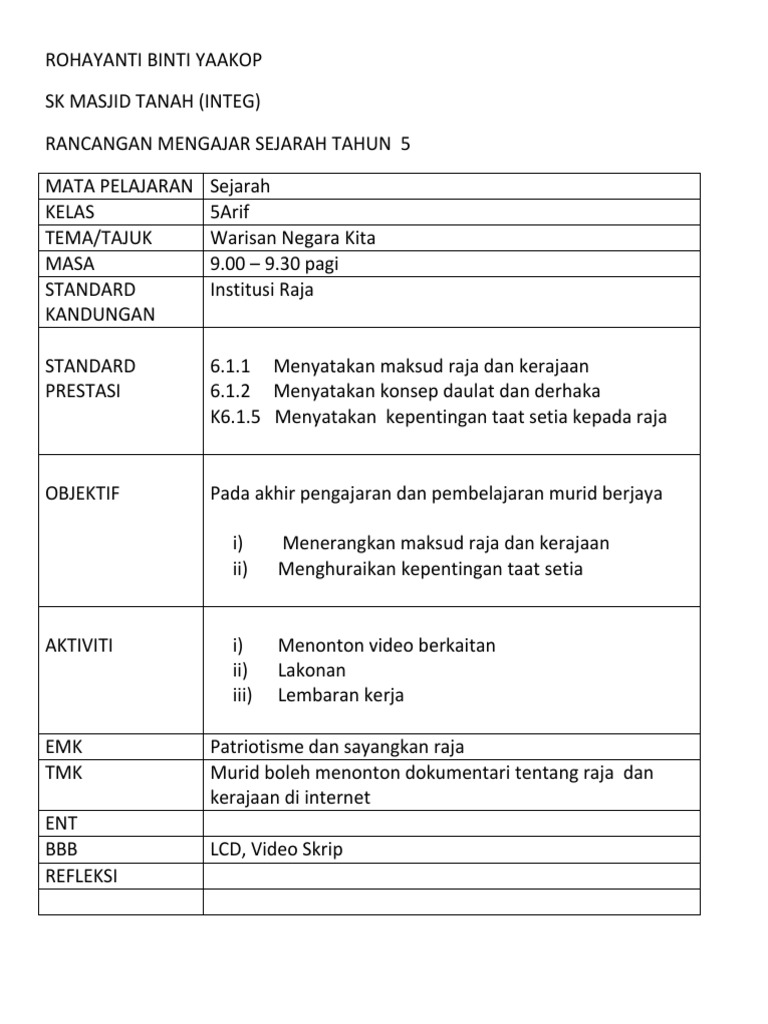 Rancangan Mengajar Sejarah Tahun 5 2014