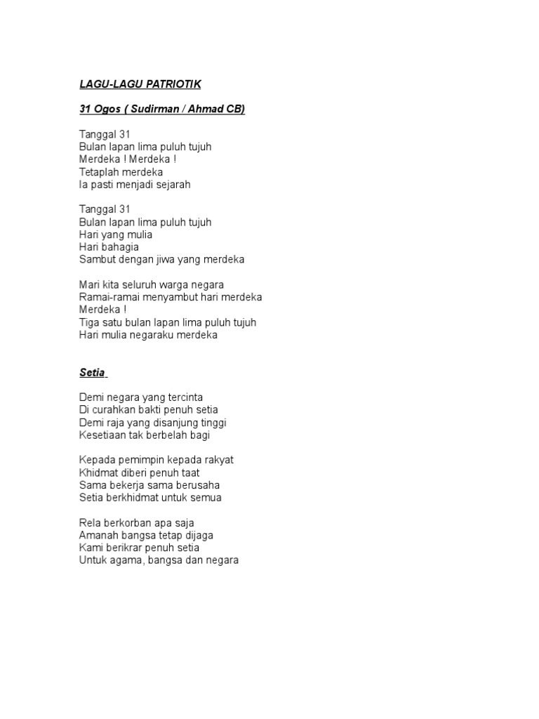 Lirik lagu 31 ogos sudirman. Tetaplah merdeka ia pasti menjadi sejarah tanggal 31 bulan lapan lima puluh tujuh hari yang. Tetaplah merdeka ia pasti menjadi sejarah tanggal 31 bulan lapan lima puluh tujuh hari yang mulia hari bahagia sambut dengan jiwa yang merdeka. Tetaplah merdeka ia pasti menjadi sejarah tanggal 31 bulan lapan lima puluh tujuh hari yang mulia hari bahagia sambut dengan jiwa yang merdeka.