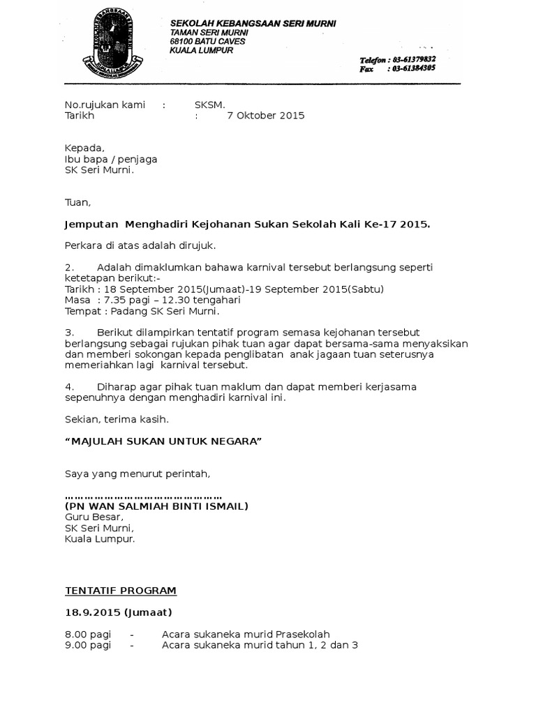 Contoh Surat Jemputan Ibu Bapa Ke Program Sekolah