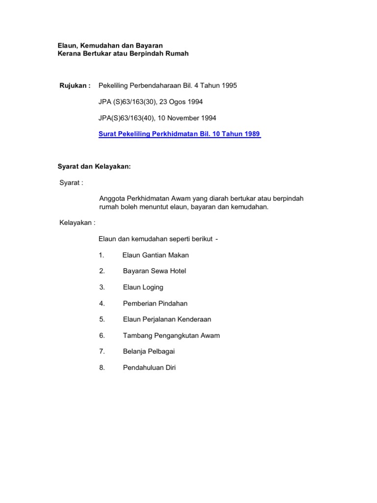 Pekeliling perbendaharaan bil 4 tahun 1995 elaun pindah rumah. Surat kelulusan perbendaharaan disertakan. 12 tahun 2001 pelarasan gaji kepada anggota memo jabatan bendahari usm pindaan kepada pelarasan gaji. Tajuk kadar pelaksanaan sistem saraan malaysia bagi anggota perkhidmatan awam persekutuan elaun perjalanan kenderaan. 3 1 tuntutan elaun perpindahan rumah hendaklah dikemukakan kepada ketua.