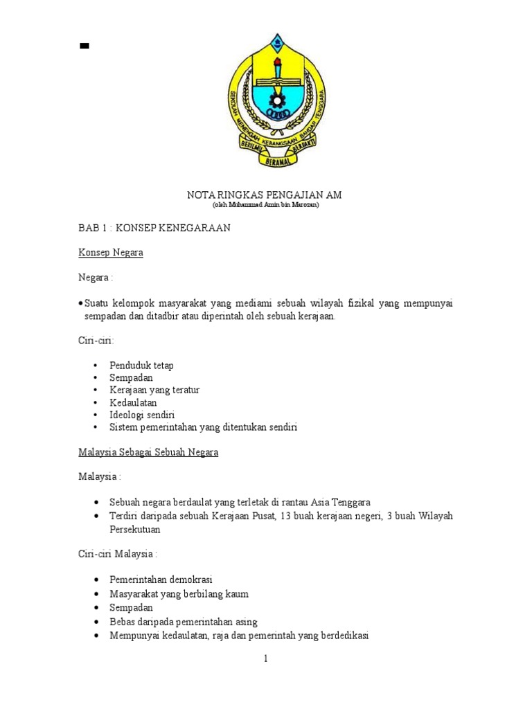 Nota Ringkas Pengajian Am Penggal 1 Docx Ringkasan Nota Pengajian Am Semester 1 Topik 1 Konsep Dan Ciri Negara Berdaulat Negara Suatu Kelompok Course Hero