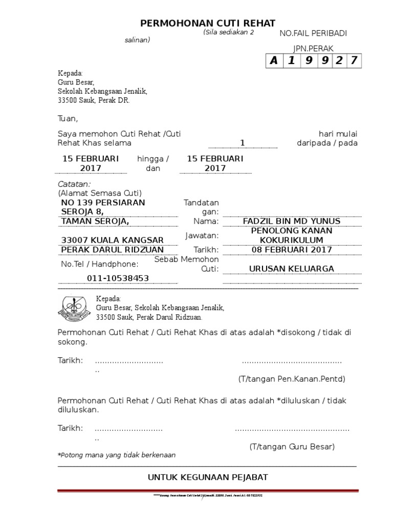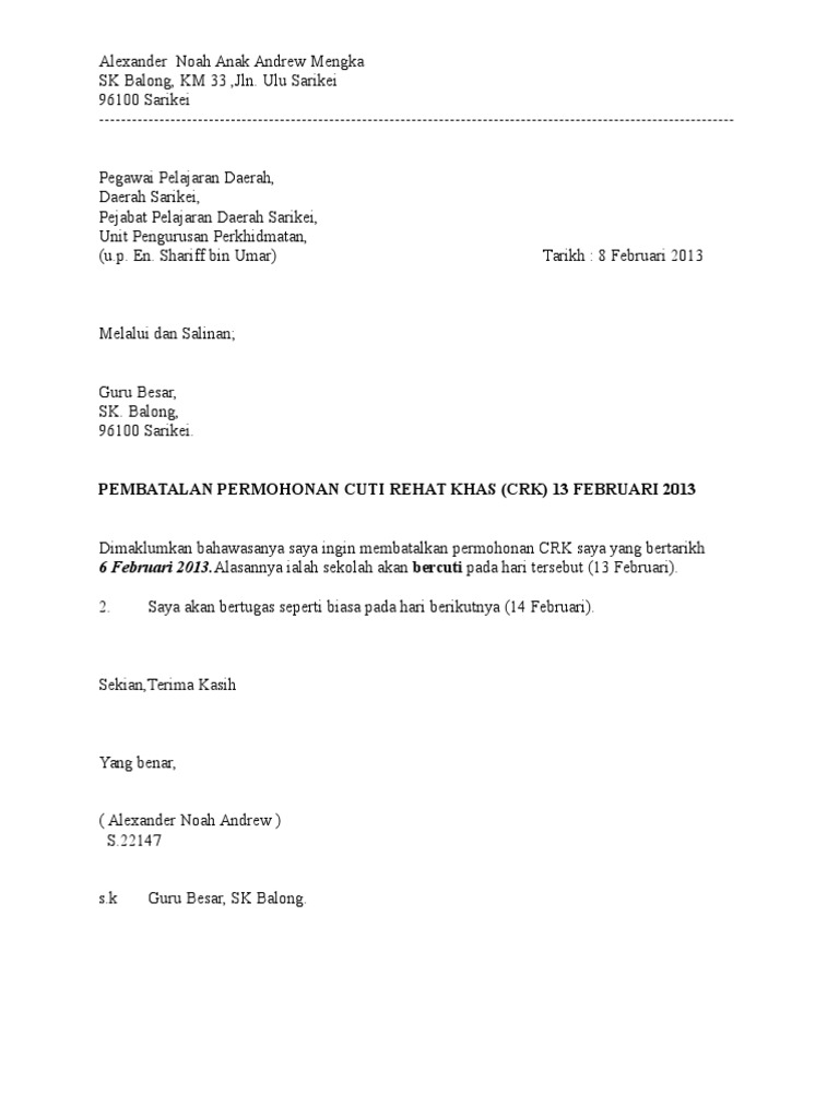 Contoh Surat Memohon Cuti Rehat Khas Rasmi L