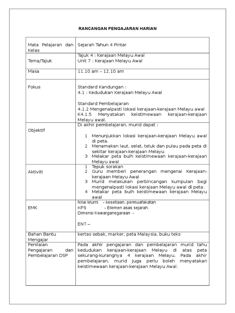 Contoh Rph Sejarah Tahun 4 Bab 1