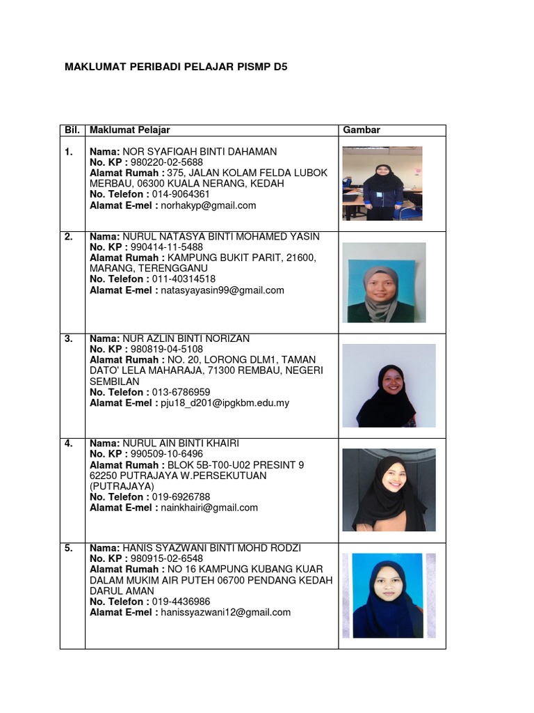Maklumat Peribadi Pelajar Pismp D5 375 Jalan Kolam Felda Lubok Merbau 06300 Kuala Nerang Kedah
