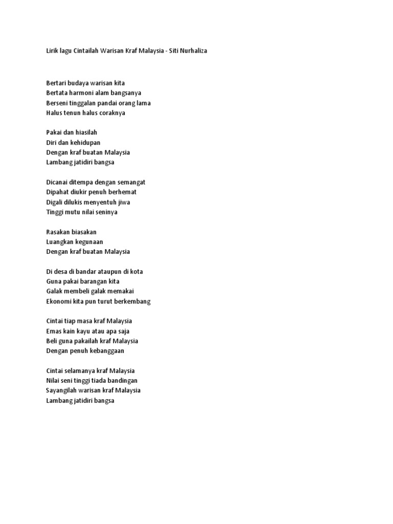 Lirik Lagu Cintailah Warisan Kraf Malaysia