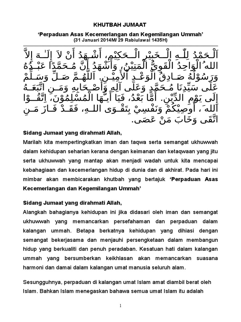 05 Khutbah Jumaat 31 Januari 2014 Perpaduan Asas Kecemerlangan Dan Kegemilangan Ummah