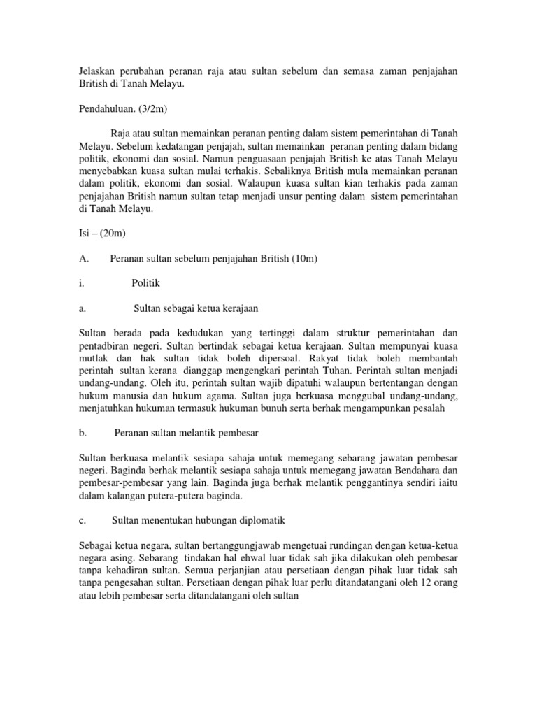 Jelaskan Perubahan Peranan Raja Atau Sultan Sebelum Dan Semasa Zaman Penjajahan British Di Tanah Melayu